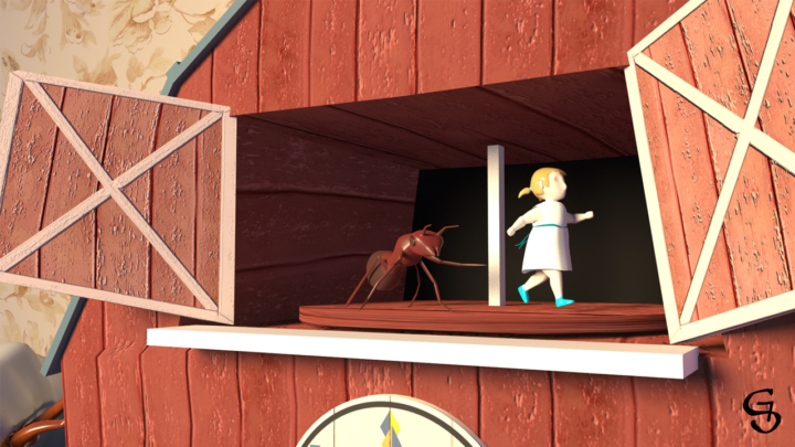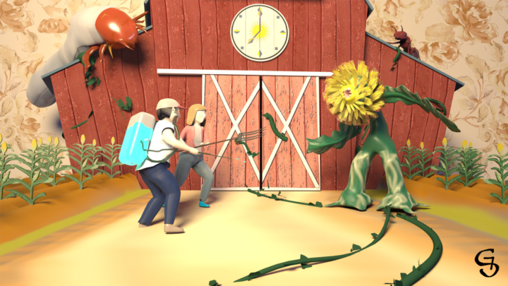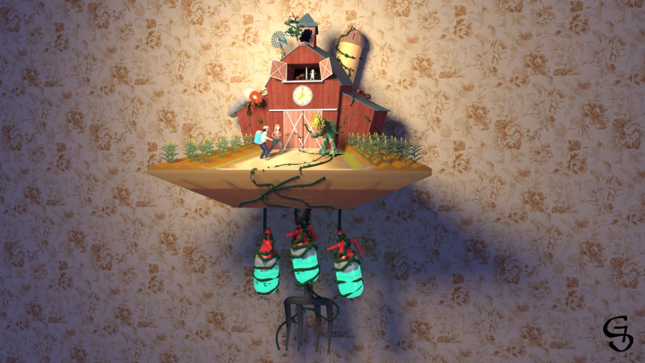 This was a project for my graduate program where we were assigned to create a cuckoo clock with a storied theme. Inspired by B-flick Horror films and the artwork of Grant Wood, this cuckoo clock portrays the story of a family farm that has been taken over by enormous bugs, weeds and pests that have been mutated by generations of radioactive chemical deterrents and the family defending their land.