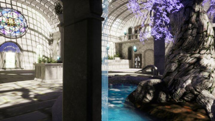 Taking that idea I repurposed the building to be a greenhouse and herbalist institute in a fantasy setting. The institute would be a place of safe refuge for the sick and wounded to seek aid, as well a location for practicing witches, druids, herbalists, or alchemists to study and practice their craft surrounded by the required plants and study materials. Given the enormous size of the space and amount of plants, I wanted to add planters fed by an aqueduct system with water in constant flow. As a center piece, there is a vibrant mystical tree that imbues the water at its roots with fertile qualities, so there is a large moon pool of water at it’s base that is the source of all the water in the room.